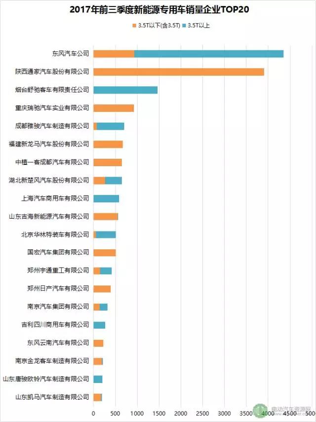 前三季度,3.5T以下(含3.5T)的新能源專用車銷量最多的企業(yè)為陜西通家,交付了3902臺,之后為東風(fēng)汽車、重慶瑞馳、福建新龍馬、中植一客、山東吉海、國宏汽車,銷量在500臺以上;3.5T以上的新能源專用車銷量最多的企業(yè)是東風(fēng)汽車,交付了3422臺,之后為煙臺舒馳、成都雅駿、上海汽車商用車,銷量在500臺以上。