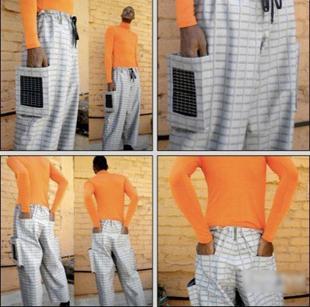 據(jù)悉,太陽能褲子的發(fā)明者是日本發(fā)明家SilvrLining。他介紹說,這條太陽能工裝褲的外形設(shè)計時尚,為低腰休閑褲款式,腰部有黑繩能當(dāng)腰帶,穿起來既運(yùn)動又休閑。褲子的布料圖案為近幾年十分流行的黑色暗格,且采用特殊的紡織布料制成,能夠起到良好的防水防油漬效果。褲腿的兩旁分別縫制有一個大口袋,每個口袋上面安置了高科技太陽能電池板。
