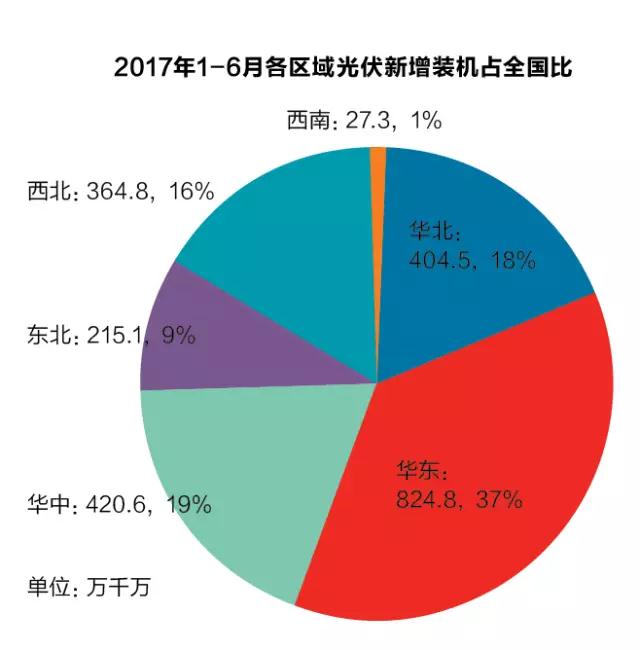 同時,光伏開發(fā)布局由西北地區(qū)向中東部地區(qū)轉(zhuǎn)移的趨勢更加明顯。1-6月,華東地區(qū)新增裝機為825萬千瓦,同比增加1.5倍,占全國的34%,其中浙江、江蘇和安徽三省新增裝機均超過200萬千瓦。華中地區(qū)新增裝機423萬千瓦,同比增加37%,占全國的17.3%。西北地區(qū)新增裝機為416萬千瓦,同比下降50%。