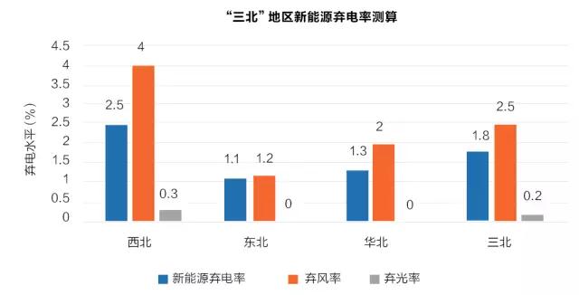 2020年,“三北”地區(qū)棄風(fēng)棄光電量70億千瓦時,棄電率2%。其中,棄風(fēng)電量68億千瓦時,棄風(fēng)率3%;棄光電量2億千瓦時,棄光率1%。西北、東北、華北地區(qū)棄風(fēng)棄光電量分別為40億千瓦時、7億千瓦時、23億千瓦時,棄電率均在5%以內(nèi)。通過多措并舉、綜合施策,2020年有望實現(xiàn)新能源棄電水平控制在5%以內(nèi)的目標。