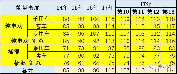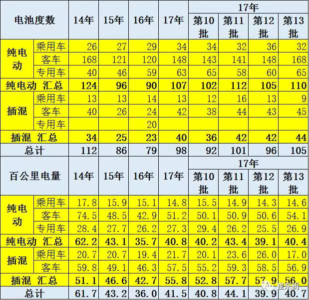 17年的第13批的新能源車的電池容量平均為105度比第12批的96度提升。這其中電動(dòng)乘用車是34度,電動(dòng)客車是148度,快充類的客車是77度左右。而插混客車車型是42度。