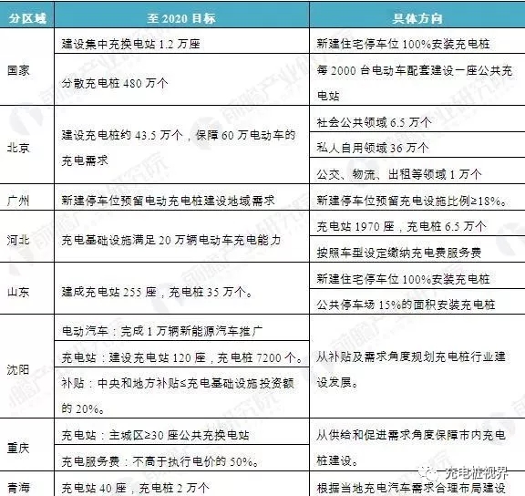 在國家政策和各省市新能源汽車產(chǎn)銷量的影響下,國內(nèi)代表性地區(qū)紛紛制定出到2020年省市充電樁的建設(shè)目標,從國家層面至2020年集中建設(shè)交換電樁1.2萬座,布局于公共場所等的分散充電樁480萬個,其他省市均從電動汽車的推廣、充電樁的建設(shè)和充電服務(wù)費角度規(guī)劃充電樁的建設(shè)布局。