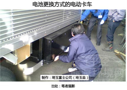 在日本,“改造電動汽車”領(lǐng)域進行著這種方式的嘗試。埼玉富士公司制作了采用電池更換方式的電動卡車(載重2噸),并于2011年6月8日通過了車檢。媒體對其改造作業(yè)的情形也進行了介紹。