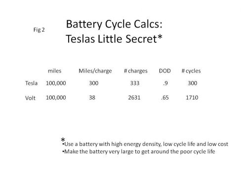 特斯拉使用高能量密度的電池,這種高能量密度電池有一個(gè)巨大的缺點(diǎn),即循環(huán)壽命低(500次循環(huán)周期) 。一個(gè)周期被定義為電池額定千瓦時(shí)的完整放電循環(huán)過(guò)程。沃藍(lán)達(dá)(Volt)利用了額定功率的65%,每次完全放電使用了0.65生命周期。特斯拉利用的電池額定功率接近90%,以85千瓦時(shí)版Model S為例,其單次充電續(xù)航里程為300公里,每次完全放電使用了0.9生命周期。行駛到10萬(wàn)英里時(shí),電池會(huì)放電333次。放電深度(DOD)達(dá)到90%相當(dāng)于300次循環(huán),可輕易達(dá)到500次循環(huán)周期。沃藍(lán)達(dá)單次充電的續(xù)航里程僅為38英里,行駛到10萬(wàn)英里時(shí),電池循環(huán)周期必須達(dá)到1710次,比特斯拉高出很多。