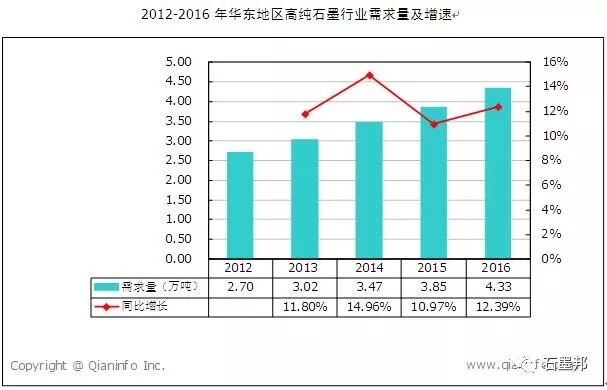 2012年,華東地區(qū)高純石墨需求量為2.70萬(wàn)噸,2013年,華東地區(qū)高純石墨需求量為3.02萬(wàn)噸,同比增長(zhǎng)11.80%,2014年,華東地區(qū)高純石墨需求量為3.47萬(wàn)噸,同比增長(zhǎng)14.96%,2015年,華東地區(qū)高純石墨需求量為是3.85萬(wàn)噸,同比增長(zhǎng)10.97%,2016年,華東地區(qū)高純石墨需求量為4.33萬(wàn)噸,同比增長(zhǎng)12.39%。