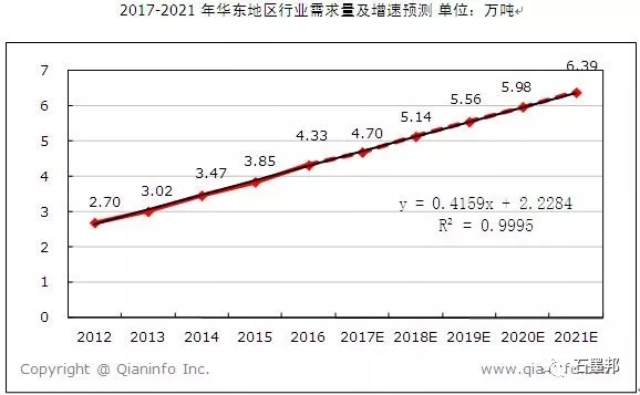 綜上所述,對(duì)華東地區(qū)需求量進(jìn)行線性擬合,得到線性擬合模型y=0.4159x+2.2284,R?=0.9995,判別系數(shù)R2接近1,說(shuō)明線性模型的擬合度比較好。根據(jù)擬合模型計(jì)算出到2021年我國(guó)華東地區(qū)行業(yè)需求量將達(dá)到6.39萬(wàn)噸。
