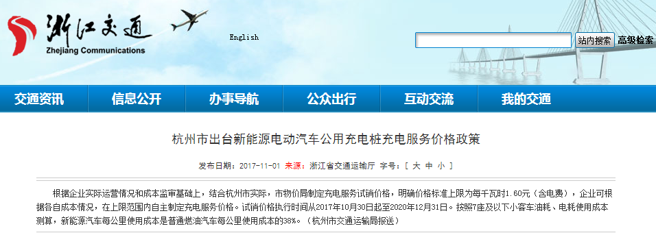 中國儲能網(wǎng)訊:11月1日,浙江省交通運輸廳正式發(fā)布了《杭州市出臺新能源電動汽車公用充電樁充電服務(wù)價格政策》,對杭州市新能源汽車公共充電樁價格進(jìn)行了規(guī)定。政策表明,根據(jù)企業(yè)實際運營情況和成本監(jiān)審基礎(chǔ)上,結(jié)合杭州市實際,市物價局制定充電服務(wù)試銷價格,明確價格標(biāo)準(zhǔn)上限為每千瓦時1.60元(含電費),企業(yè)可根據(jù)各自成本情況,在上限范圍內(nèi)自主制定充電服務(wù)價格。試銷價格執(zhí)行時間從2017年10月30日起至2020年12月31日。按照7座及以下小客車油耗、電耗使用成本測算,新能源汽車每公里使用成本是普通燃油汽車每公里使用成本的38%。