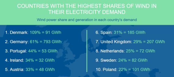 從歐盟成員國來看,丹麥的風力發(fā)電量產生剩余,是其國內需求的1.09倍,德國風力發(fā)電量占其國內需求的61%。