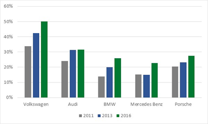 奧迪、寶馬、奔馳和保時捷在中國市場的銷量在其全球范圍內(nèi)銷量當(dāng)中的占比均在1/4至1/3內(nèi),與過去5年相比增長了10%。此外,大眾在中國的銷量在全球銷量當(dāng)中的占比近50%。其他境外品牌在中國市場的表現(xiàn)也表明特斯拉如果能夠減少成本,價格符合當(dāng)?shù)厥袌鏊?,那么將也會有不俗表現(xiàn)。