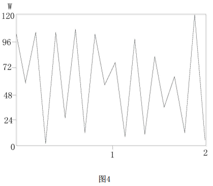 并且,PLC根據(jù)計(jì)算得到的瞬時(shí)電壓U和瞬時(shí)電流I,利用公式(4)計(jì)算得出風(fēng)力發(fā)電單元110的瞬時(shí)輸出功率。并將其計(jì)算出的瞬時(shí)功率實(shí)時(shí)發(fā)送至所述觸控單元180,以使所述觸控單元180進(jìn)行實(shí)時(shí)顯示。所述瞬時(shí)輸出功率P在所述觸控單元180上以曲線形式呈現(xiàn)。本實(shí)施例中,在具體實(shí)施時(shí),得到的風(fēng)力發(fā)電單元110的輸出電壓U和輸出功率I的變化曲線如圖3和圖4所示。并且所述風(fēng)力發(fā)電單元110將產(chǎn)生的電能通過所述風(fēng)電充電控制器120輸送至所述風(fēng)能蓄電池進(jìn)行電能存儲(chǔ)??蛇x地,在本實(shí)施例中,所述風(fēng)電充電控制器120的型號(hào)為FW03-12,所述風(fēng)能蓄電池的型號(hào)為OT7-12。