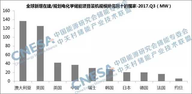從地域分布上看,2017年三季度,全球新增投運項目中,英國、中國和日本是裝機規(guī)模排在前三位的國家。這三個國家的項目全部應用在集中式可再生能源并網(wǎng)和輔助服務領域;新增在建/規(guī)劃項目中,澳大利亞、美國和英國是裝機規(guī)模排在前三位的國家,這三個國家的項目主要分布在集中式可再生能源并網(wǎng)和輔助服務領域,比重達到91%。