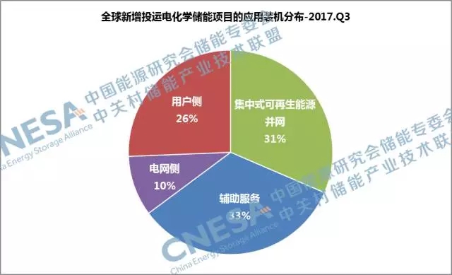 從應用分布上看,2017年第三季度,全球新增投運儲能項目中,輔助服務領域的裝機規(guī)模最大,為31.5MW,比重為33%,同比增長6200%,環(huán)比增長75%。項目主要集中在歐洲的英國、德國和比利時等國家,例如英國的布里斯托爾和達靈頓調(diào)頻儲能項目等,儲能以獨立電站或者與燃氣輪機聯(lián)合運行的方式參與歐洲的平衡市場,提供一次調(diào)頻服務。