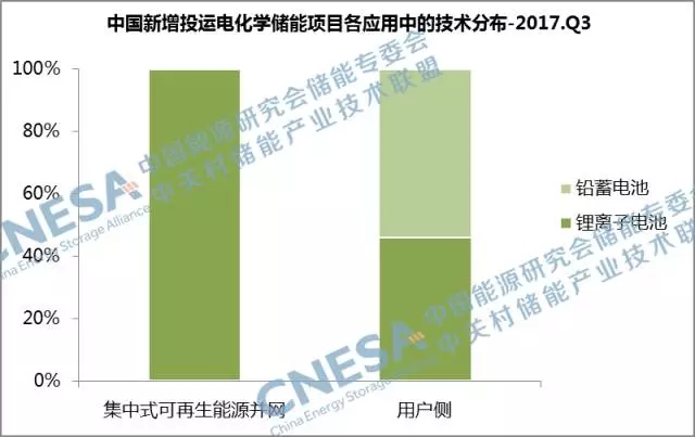 從應用分布上看,新增投運項目全部應用在集中式可再生能源并網(wǎng)和用戶側(cè)領域,且用戶側(cè)領域的裝機規(guī)模最大,為17.8MW,比重為78%,同比增長67%,環(huán)比增長287%。從三季度用戶側(cè)領域的技術分布上看,全部應用的鋰離子電池和鉛蓄電池技術,且鉛蓄電池的裝機占比最大,為54%。