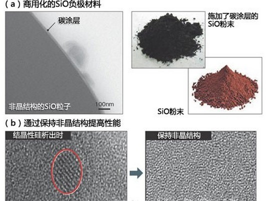 大阪鈦業(yè)科技的負極材料的特點在于,采用了保持非晶構(gòu)造的SiO。SiO本身沒有導(dǎo)電性,所以通過化學(xué)氣相沉積(CVD)法在SiO粒子周圍形成了碳涂層(圖1)。
