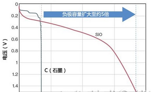 SiO與石墨相比,負極容量可擴大至5倍。(圖由《日經(jīng)電子》根據(jù)大阪鈦業(yè)科技公司的資料制作)