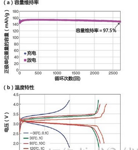 日本產(chǎn)業(yè)技術(shù)綜合研究所利用正極材料組合使用磷酸鐵鋰(LiFePO4)的電池單元實施了多種試驗(圖3)。結(jié)果顯示,在60℃的環(huán)境下,10C(6分鐘充電/6分鐘放電)的充放電循環(huán)特性在循環(huán)2700次后與循環(huán)100次后相比,保持了97.5%的容量。溫度特性方面,可在-30℃~120℃之間利用,-30℃下也能放電58%以上的容量。