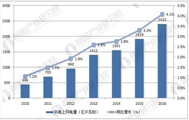 中國風(fēng)電上網(wǎng)電量占總發(fā)電量比例逐年增加,2016年風(fēng)電上網(wǎng)電量為2410億千瓦時(shí),占總發(fā)電量的比重達(dá)4.08%, 超越核電(3.56%)和光伏(1.12%)成為我國第一大新能源發(fā)電形式。隨著國家能源局一些列消納措施的落地,風(fēng)電上網(wǎng)電量逐漸攀升,棄風(fēng)限電有望逐步緩解,行業(yè)逐步轉(zhuǎn)向市場化。