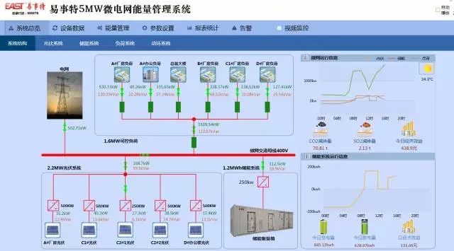 該儲能電站建成投運,標(biāo)志著國內(nèi)工業(yè)園區(qū)大型光儲微電網(wǎng)典型示范工程誕生,易事特微電網(wǎng)系統(tǒng)走在了行業(yè)的前列。易事特5MW微電網(wǎng)由2.2MW屋頂分布式光伏發(fā)電系統(tǒng)、1.2MWH儲能系統(tǒng)、1.6MW可控負荷、計量系統(tǒng)、微電網(wǎng)能量管理系統(tǒng)、智能配電及保護裝置等組成,可實現(xiàn)對光伏及負荷功率的預(yù)測,儲能系統(tǒng)峰谷時段削峰填谷、系統(tǒng)經(jīng)濟優(yōu)化調(diào)度控制等。未來可替代火力發(fā)電或柴油機發(fā)電等常規(guī)發(fā)電方式,廣泛應(yīng)用于工業(yè)園區(qū)、工廠、商業(yè)圈、海島及不通電地區(qū)的分布式發(fā)電站、智能微電網(wǎng)與高效智能配電網(wǎng)建設(shè)。