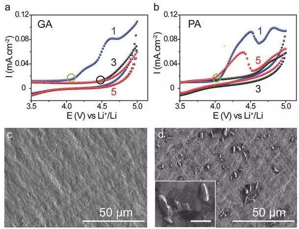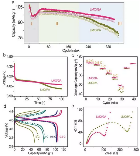 (a) LMO/PA 和 LMO/GA 電池的長時間低倍率循環(huán)性能,實心和圓圈分別是Ccha 和 Cdis;