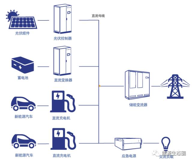 直流微網(wǎng)主要應(yīng)用于電動汽車充電站、工商業(yè)園區(qū)及一些應(yīng)急供電的場合。系統(tǒng)組成主要考慮兩點(diǎn):1、發(fā)揮光伏的最大作用。因?yàn)槲⒕W(wǎng)中光伏和儲能板塊是不可缺少的,而且儲能是整個(gè)微網(wǎng)設(shè)備的核心組成部分。光伏發(fā)電一般是直流電,將光伏發(fā)的直流電通過中間裝置并入到直流母線,將電池通過中間的直流變換器接入到系統(tǒng),這樣光伏發(fā)電就不需要逆變之后再整流回來給電池充電,整個(gè)系統(tǒng)的轉(zhuǎn)化效率就會非常高。2、目前電動汽車的充電技術(shù)主要采用交流充電樁或者直流充電樁,這類充電樁的能量來源于交流電,搭建一個(gè)直流微網(wǎng)將能量流動通過直流充電DC的變換,直接給電動汽車充電,最大化提高系統(tǒng)的轉(zhuǎn)化效率和利用效率。整個(gè)系統(tǒng)通過儲能變流器跟電網(wǎng)連接,起到互補(bǔ)的作用,當(dāng)光伏能量不足或者負(fù)載供電、直流源等類似的負(fù)載需要供電時(shí),就可以通過電網(wǎng)取電;當(dāng)光伏發(fā)的電消耗不完時(shí)可以余電上網(wǎng)。
