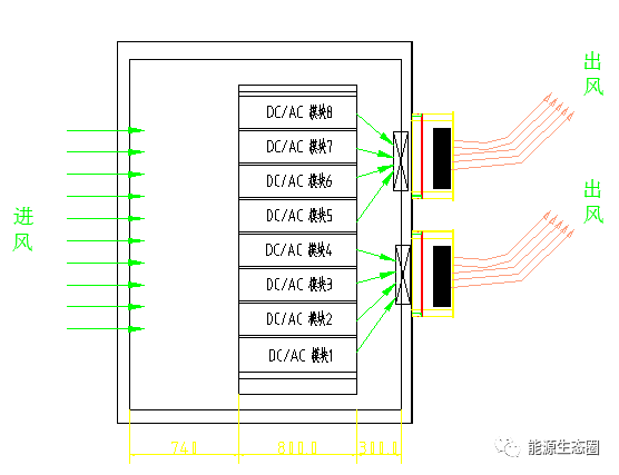 1MW集裝箱式變流器散熱設(shè)計(jì)采用前進(jìn)分后出風(fēng)的設(shè)計(jì),這種設(shè)計(jì)適用于將所有PCS全部放置在同一個(gè)集裝箱的儲能電站。