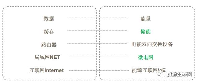 儲能和互聯(lián)網(wǎng)存在一一對應(yīng)的關(guān)系。儲能中的能量對應(yīng)的就是互聯(lián)網(wǎng)中的數(shù)據(jù);電池就是所說的儲能,對應(yīng)的就是互聯(lián)網(wǎng)中的緩存;儲能變流器雙向變換設(shè)備對應(yīng)互聯(lián)網(wǎng)中路由器的作用;儲能中的微電網(wǎng)就相當(dāng)于局域網(wǎng);所有數(shù)據(jù)和設(shè)備加在一起組成了能源互聯(lián)網(wǎng),相當(dāng)于互聯(lián)網(wǎng)的構(gòu)造。
