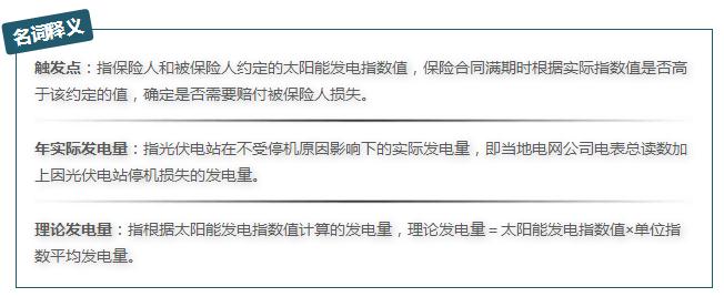 瑞士再保險(xiǎn)公司(Swiss Re-insurance Company)也與國內(nèi)保險(xiǎn)公司合作設(shè)計(jì)開發(fā)了太陽能輻射發(fā)電指數(shù)保險(xiǎn)產(chǎn)品。保險(xiǎn)合同約定,當(dāng)所投保的太陽能光伏電站因保險(xiǎn)期間內(nèi)太陽輻射不足,導(dǎo)致發(fā)電量減少,保險(xiǎn)人將承擔(dān)賠償責(zé)任。