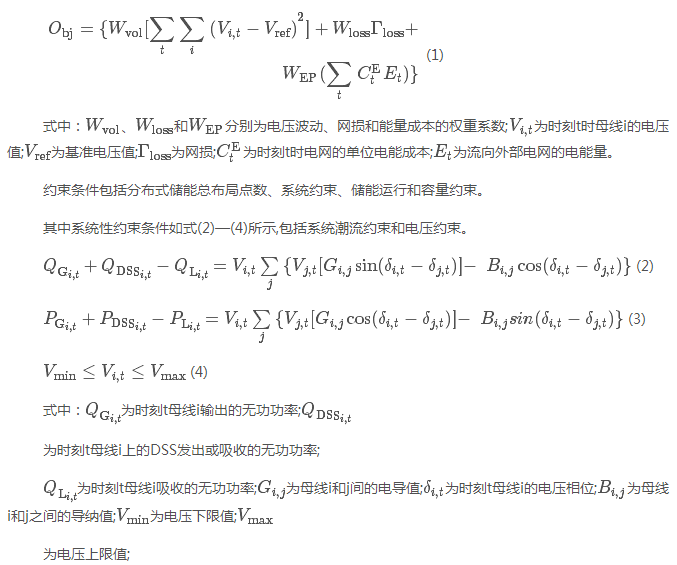 目前,分布式儲(chǔ)能的應(yīng)用場(chǎng)景主要包含用戶側(cè)、分布式電源側(cè)和配網(wǎng)側(cè)3個(gè)方面,其投資主體包括用戶、分布式電源投資商和電網(wǎng)公司,多以分布式電源、用戶側(cè)或微電網(wǎng)為背景引入,電動(dòng)汽車(chē)也是其中的一種重要組成。在配網(wǎng)中,關(guān)于分布式儲(chǔ)能規(guī)劃技術(shù)的研究主要涉及容量?jī)?yōu)化配置及選點(diǎn)布局2個(gè)方面,并且當(dāng)需要同時(shí)開(kāi)展容量和選點(diǎn)研究時(shí),鑒于二者間存在的強(qiáng)耦合關(guān)系,在目前國(guó)內(nèi)外開(kāi)展的研究中,往往將之作為一體化問(wèn)題處理,多通過(guò)將分布式儲(chǔ)能規(guī)劃描述為一個(gè)優(yōu)化問(wèn)題,優(yōu)化目標(biāo)和約束條件隨應(yīng)用場(chǎng)景和應(yīng)用目標(biāo)而變。優(yōu)化目標(biāo)主要包括技術(shù)性目標(biāo)和經(jīng)濟(jì)性目標(biāo)兩類,約束條件一般包含儲(chǔ)能設(shè)備布局總點(diǎn)數(shù)、儲(chǔ)能本身和系統(tǒng)運(yùn)行方面的約束條件。