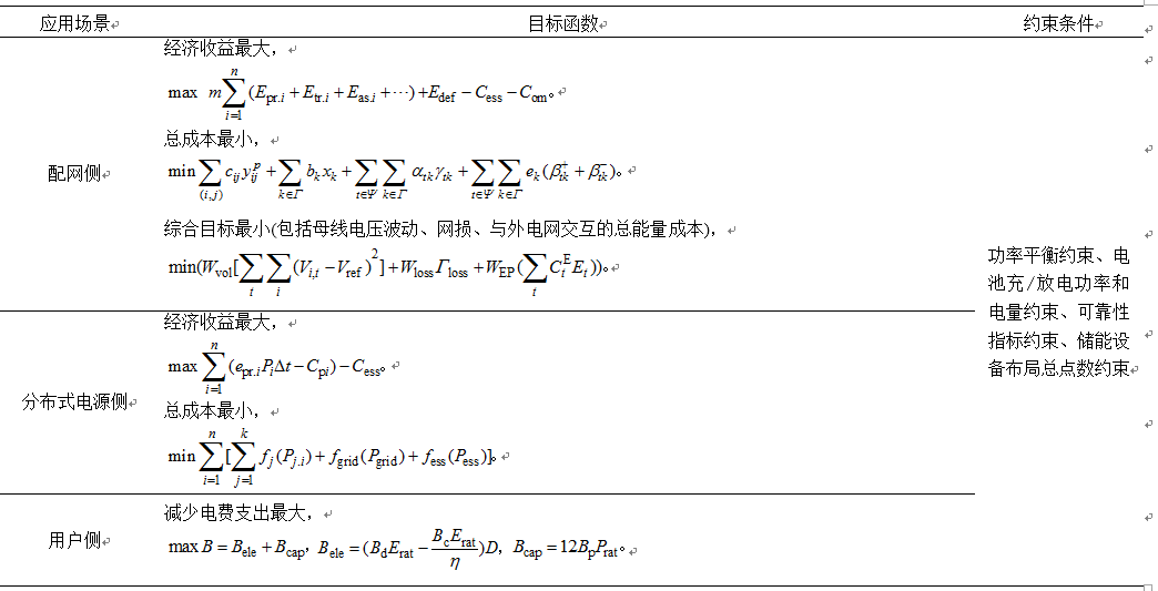 分布式儲(chǔ)能應(yīng)用于不同場(chǎng)景下的目標(biāo)函數(shù)及約束條件如表2所示。