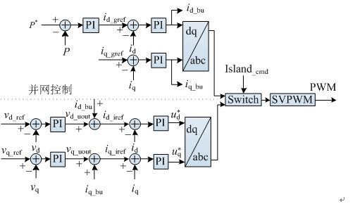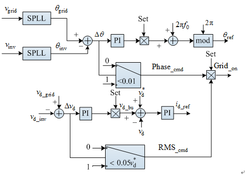 在一些特殊的場(chǎng)合下,分布式儲(chǔ)能設(shè)備需要有并網(wǎng)和離網(wǎng)運(yùn)行2種工作模式,這2種工作模式之間的切換需要盡可能平滑,減小對(duì)用戶或電網(wǎng)的沖擊和影響,使分布式儲(chǔ)能設(shè)備能夠柔性接入和退出的控制技術(shù)是實(shí)現(xiàn)分布式儲(chǔ)能設(shè)備即插即用的基礎(chǔ)。通過(guò)并網(wǎng)切換孤島過(guò)程補(bǔ)償算法與孤島切換并網(wǎng)過(guò)程預(yù)同步方法[31]可以實(shí)現(xiàn)2種工況的無(wú)縫切換,具體控制策略見(jiàn)圖3和圖4,圖中變量定義參見(jiàn)文獻(xiàn)[31]。