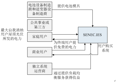 目前,與分布式光伏組合形成的分布式光儲(chǔ)系統(tǒng)在國(guó)外已有較多的商業(yè)應(yīng)用,在不同的國(guó)家,分布式光儲(chǔ)發(fā)電的應(yīng)用重點(diǎn)各不相同,美國(guó)加州在工商業(yè)領(lǐng)域的分布式項(xiàng)目居多,澳大利亞和德國(guó)市場(chǎng)的重點(diǎn)在戶用儲(chǔ)能領(lǐng)域。以德國(guó)SENEC.IES公司為例,該公司將用戶側(cè)儲(chǔ)能聚集起來(lái)開(kāi)展“免費(fèi)午餐”模式,享有對(duì)電池的主要控制權(quán),當(dāng)電網(wǎng)“零電價(jià)”時(shí)控制電池從電網(wǎng)充電。用戶主要通過(guò)最大化地自我消納屋頂光伏所發(fā)的電力、使用SENEC.IES 提供給用戶的“免費(fèi)儲(chǔ)存的電力”,實(shí)現(xiàn)更低的電費(fèi)賬單,進(jìn)而獲益。SENEC.IES的商業(yè)模式見(jiàn)圖7。