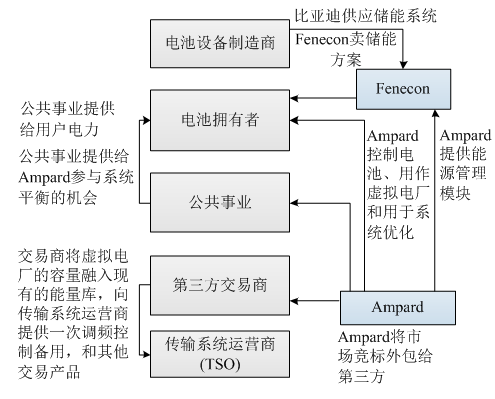 用戶為了增加自發(fā)自用而購(gòu)買(mǎi)儲(chǔ)能系統(tǒng),Ampard利用他們的能源管理系統(tǒng)(Ampard Energy Manager)將這些系統(tǒng)管理起來(lái),為這些儲(chǔ)能系統(tǒng)增加虛擬電廠的功能提供一次調(diào)頻控制和備用等服務(wù)。Fenecon/Ampard的商業(yè)模式見(jiàn)圖8。