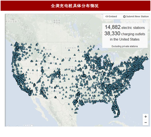 電動汽車的主流充電設(shè)備可分為三大類——交流Level1充電設(shè)施、交流Level2充電設(shè)施和直流FastCharger充電設(shè)施。其中已經(jīng)建立起一定規(guī)模和完善充電網(wǎng)絡(luò)的是交流Level2充電設(shè)施,其安裝數(shù)量最多,分布面積也最廣;其次是直流FastCharger充電設(shè)施,主要布點(diǎn)于城際及州際高速公路上,為長途駕駛的電動汽車提供快速補(bǔ)電服務(wù)。充電設(shè)施已基本覆蓋全美。