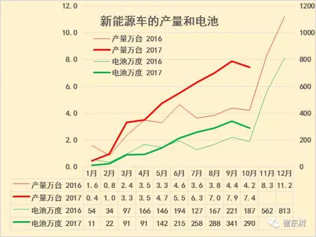 根據(jù)崔東樹個(gè)人測(cè)算,按照汽車生產(chǎn)合格證數(shù)據(jù):2017年10月新能源汽車產(chǎn)量7.4萬(wàn)臺(tái),增長(zhǎng)76%;電池裝機(jī)總電量約290萬(wàn)度,同比增長(zhǎng)55%。由于10月生產(chǎn)時(shí)間短,10月新能源汽車產(chǎn)量環(huán)比9月下降6%,鋰電池裝車量環(huán)比9月下降15%。從1-9月的汽車走勢(shì)看,電池需求和整車數(shù)量都是是逐步增長(zhǎng)狀態(tài),尤其是在常規(guī)車型持續(xù)低迷的背景下,新能源車持續(xù)環(huán)比增長(zhǎng)是令人振奮的。而10月的環(huán)比下降主要是工作日時(shí)間等影響,并非產(chǎn)銷的動(dòng)力不強(qiáng)的問(wèn)題。