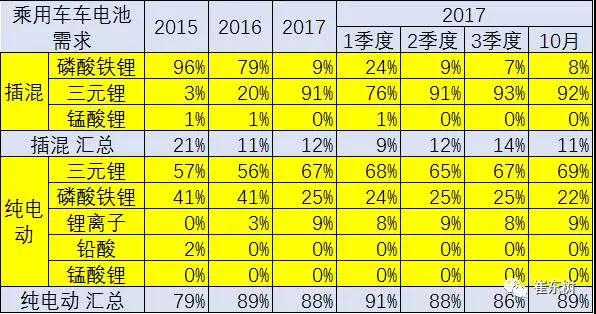 專用車的三元化趨勢(shì)很明顯。1-10月的三元電池的裝車量達(dá)到62%的占比,而16年的占比是35%.10月達(dá)到71%,三元提升的趨勢(shì)相對(duì)是合理的狀態(tài)。