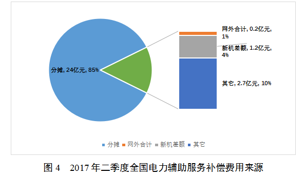 各區(qū)域電力輔助服務(wù)補(bǔ)償費(fèi)用主要來源于機(jī)組分?jǐn)傎M(fèi)用,在其他費(fèi)用來源上略有差異。華東區(qū)域一部分費(fèi)用來自網(wǎng)外跨區(qū)水電分?jǐn)偮涞厥》莸妮o助服務(wù)費(fèi)用。東北區(qū)域網(wǎng)外分?jǐn)偤途W(wǎng)外收取的費(fèi)用在各省之間互抵。西北、華東和東北區(qū)域因沒有新機(jī)并網(wǎng),故2017年二季度無新機(jī)差額款項(xiàng)。