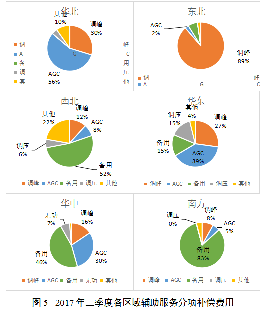 圖3 2017年二季度各區(qū)域各項(xiàng)電力輔助服務(wù)補(bǔ)償費(fèi)用情況