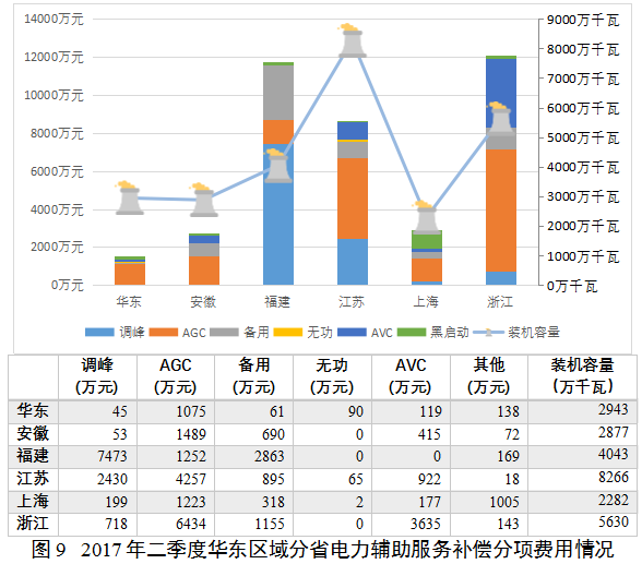 華東區(qū)域由于江浙滬地區(qū)以火電為主的電源結(jié)構(gòu)在消納區(qū)外來電和可再生能源時(shí)面臨的調(diào)峰壓力,本地備用容量也存在部分富余,電力輔助服務(wù)補(bǔ)償費(fèi)用以調(diào)峰、AGC補(bǔ)償為主,但備用補(bǔ)償占比也較為明顯。