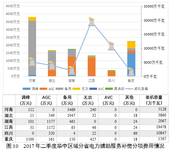 華中區(qū)域的河南、湖北以備用補(bǔ)償為主,重慶以調(diào)峰為主,其他省市以AGC補(bǔ)償為主。河南受負(fù)荷增長放緩、煤價(jià)走高,以及外來電等多方面的影響,采取了機(jī)組輪停冷備的方式實(shí)現(xiàn)調(diào)峰,體現(xiàn)在備用補(bǔ)償費(fèi)中。重慶負(fù)荷峰谷差明顯,又作為四川水電的落地點(diǎn)之一,本地電源調(diào)峰壓力較大,補(bǔ)償力度也明顯高于區(qū)域內(nèi)其他省份(見圖10)。