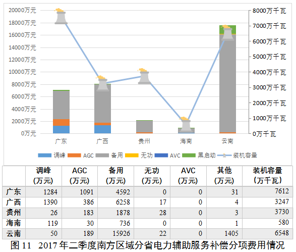 南方區(qū)域除廣東、廣西以AVC補(bǔ)償為主外,其他省份尤其是云南省,由于水電裝機(jī)規(guī)模較大,以備用補(bǔ)償為主。總體來看,南方區(qū)域裝機(jī)容量與補(bǔ)償費(fèi)用的總體趨勢相近,補(bǔ)償力度在各?。▍^(qū))基本一致(見圖11)。