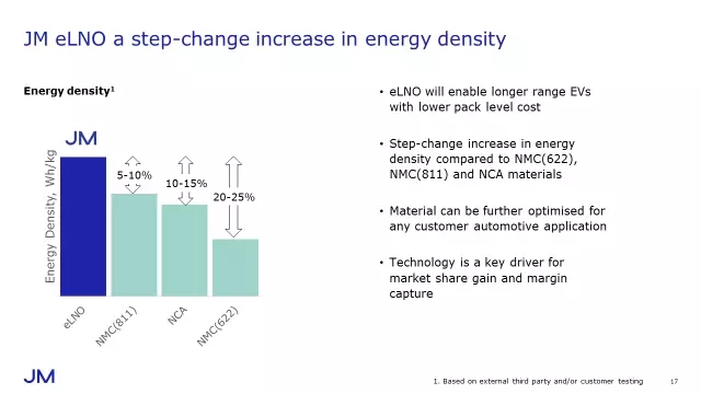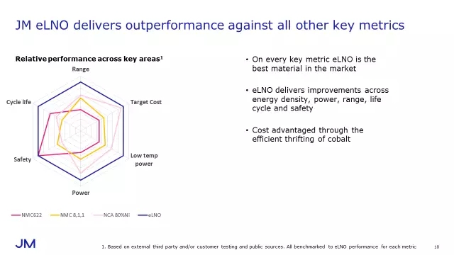 目前,LFP是莊信萬豐最大的正極材料業(yè)務(wù),并將繼續(xù)向功率型和能量型兩個(gè)細(xì)分領(lǐng)域挖掘LFP的價(jià)值。而莊信萬豐現(xiàn)階段主推的產(chǎn)品是一種高能量鎳基正極材料,內(nèi)部也稱之為增強(qiáng)型鎳酸鋰(eLNO),其能量密度超過了當(dāng)前所有的三元體系。