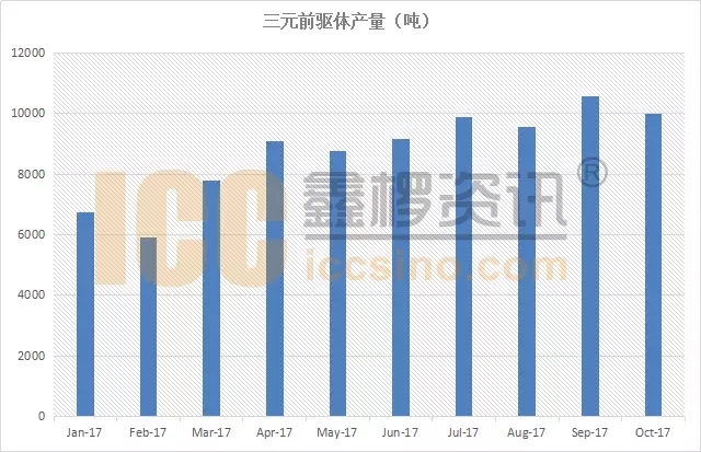在正極材料市場,2017年是標(biāo)準(zhǔn)的“三元年”,市場的認(rèn)可度及需求量都在穩(wěn)步的增加。受此帶動,三元前驅(qū)體市場也是供不應(yīng)求,增長迅速。根據(jù)鑫欏資訊統(tǒng)計,2016年三元前驅(qū)體生產(chǎn)量約6.67萬噸,而2017年這一數(shù)字將突破10萬噸:截止到10月份,累計產(chǎn)量已達(dá)到8.7萬噸。