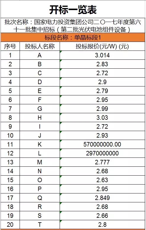 中國儲(chǔ)能網(wǎng)訊:11月16日,國家電力投資集團(tuán)2017年第六十一批700MW組件集中采購(儲(chǔ)備容量為2700MW)開標(biāo),據(jù)光伏們了解,共有28家組件企業(yè)參與了此次招標(biāo)。