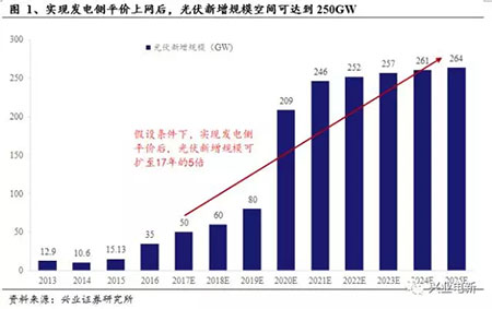 在約束條件下,基于能源平衡表,我們認(rèn)為,平價(jià)上網(wǎng)后光伏裝機(jī)每年新增規(guī)??傻?50GW左右,為17年50GW規(guī)模的5倍!