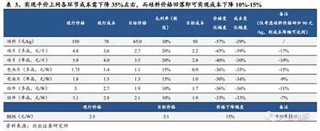 根據(jù)行業(yè)內(nèi)一線企業(yè)的價(jià)格、成本及盈利能力,我們假設(shè)實(shí)現(xiàn)組件端2元/W時(shí),硅料、硅片、電池片及組件毛利率分別為30%、20%、15%及10%。則可作出如下表所示的價(jià)格成本變化路線,各環(huán)節(jié)成本下降35%左右。