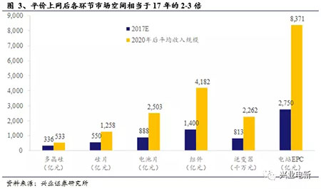按照前述假設(shè)及測(cè)算結(jié)果,假設(shè)2020年達(dá)到平價(jià)條件,2017-2020年各環(huán)節(jié)成本均勻下降,2020年以后成本下降幅度收窄。則僅看國(guó)內(nèi)每年新增規(guī)模,多個(gè)環(huán)節(jié)將催生千億市場(chǎng)空間。