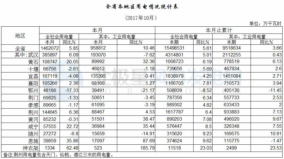 (五)各地區(qū)全社會(huì)和工業(yè)用電情況分化,個(gè)別地市受去產(chǎn)能因素影響全社會(huì)和工業(yè)用電出現(xiàn)較大降幅。10月份全省14個(gè)用電統(tǒng)計(jì)地區(qū)中,武漢、黃石、荊州等7個(gè)地區(qū)全社會(huì)用電不同程度增長(zhǎng),其中黃石、咸寧、恩施和神農(nóng)架4個(gè)地區(qū)全社會(huì)用電增幅在兩位數(shù)以上;從工業(yè)用電情況看,黃石、荊州、黃岡等7個(gè)地區(qū)用電增長(zhǎng),其中黃石、黃岡、咸寧、恩施等5個(gè)地區(qū)工業(yè)用電增幅在30%以上。鄂州市受其主導(dǎo)產(chǎn)業(yè)鋼鐵去產(chǎn)能因素影響,全社會(huì)和工業(yè)用電持續(xù)下降,該市本月全社會(huì)和工業(yè)用電降幅仍為兩位數(shù)。