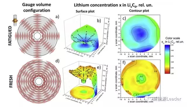 中子衍射技術(shù)是一種利用不同材料對中子輻射的遮擋率不同,對材料進(jìn)行分析的技術(shù),憑借著中子輻射強(qiáng)大的穿透力,我們能夠在不破壞鋰離子電池結(jié)構(gòu)的前提下對鋰離子電池內(nèi)部Li的分布進(jìn)行原位的分析研究。來自德國Helmholtz化學(xué)儲能研究所(HIU)和卡爾斯魯厄理工學(xué)院的M.J. Mu?hlbauer等【2】利用中子衍射技術(shù)對電池衰降對電池中Li資源分布的影響進(jìn)行了研究,發(fā)現(xiàn)隨著電池老化,不僅僅電池內(nèi)可利用的Li資源在減少,Li在電池的直徑方向還出現(xiàn)了較為明顯的分布不均勻的現(xiàn)象。
