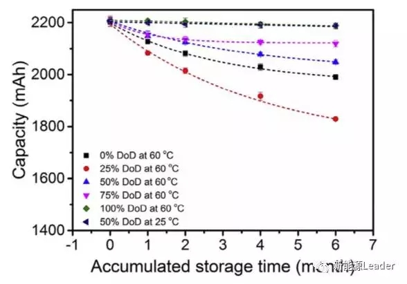 下圖為不同放電深度DOD下的電池在存儲不同時間后的剩余容量,可以看到在存儲6個月后,放電深度為0%,25%,50%和75%的電池的容量損失率分別為9.7%、17.2%、7.3%和0.9%,而50%DOD的電池在25攝氏度下存儲6個月,容量損失為1%。從結(jié)果可以看到放電深度DOD對于電池的存儲容量衰降具有顯著的影響,75%DOD的電池在存儲過程中容量衰降是最少的,同樣的溫度也是影響鋰離子電池存儲容量衰降的重要因素,25℃下鋰離子電池的容量衰降要明顯低于60℃下存儲的電池。
