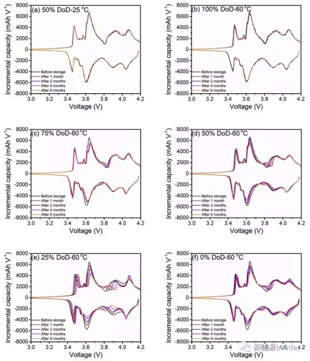 為了分析鋰離子電池在高SoC和高溫下的衰降機(jī)理,Po-Han Lee對不同的SoC狀態(tài)存儲的電池進(jìn)行了ICP(容量增量法)分析,結(jié)果如下圖所示。ICP曲線中的每個峰都代表一個反應(yīng),從圖中可以看到25℃下50%DOD存儲和60℃下100%DOD存儲的電池在經(jīng)過1、2、4和6個月后ICP曲線沒有發(fā)生明顯的變化,表明存儲過程中鋰離子電池內(nèi)部的副反應(yīng)比較少。